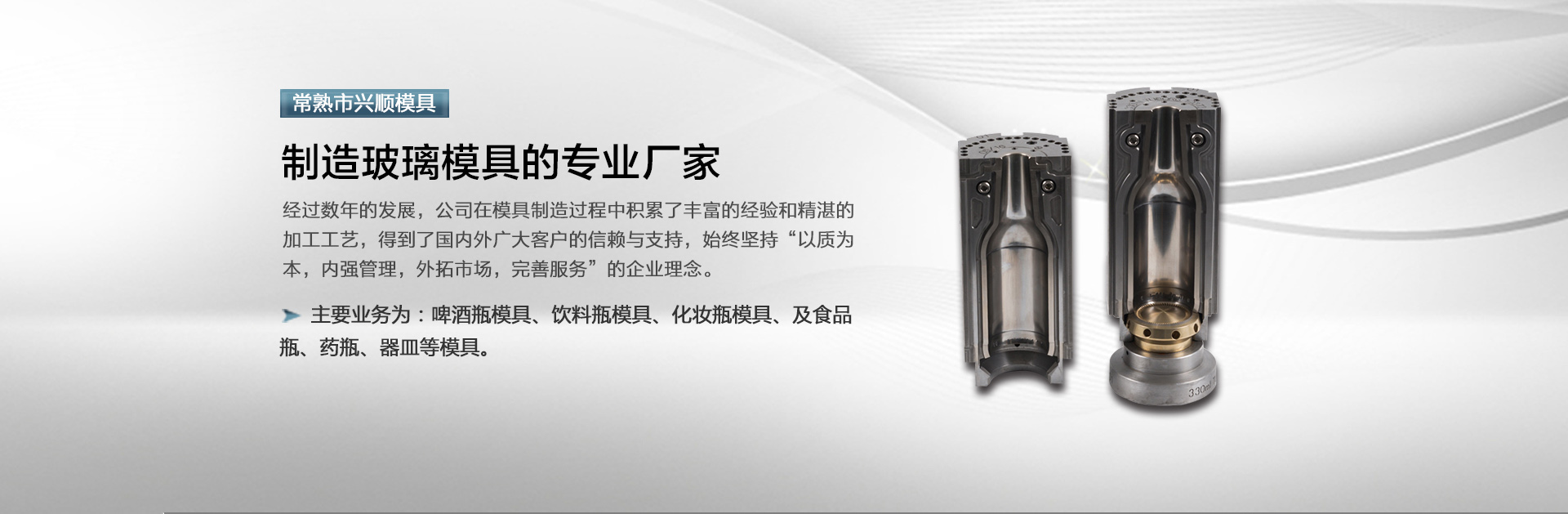 常熟市興順模具有限公司位于中國玻璃模具之鄉——江蘇常熟沙家浜,是一家制造玻璃模具的廠家。公司成立于1992年,主要業務為:啤酒瓶模具、飲料瓶模具、化妝瓶模具、及食品瓶、藥瓶、器皿等模具。我們擁有23年的模具制造經驗,目前公司擁有員工100多人,我們公司目前主要出口到印度,西班牙,意大利,俄羅斯,越南,泰國等等。公司目前裝備有50多臺CNC車床和雕銑設備,一些是從日本引進的小巨人,還有德國的德瑪吉,我們有自己的鑄造車間來保證模具材料的穩定性。